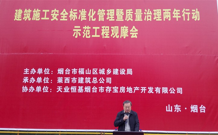 12月1日,煙臺市福山區(qū)城鄉(xiāng)建設(shè)局主辦的煙臺市“建筑施工標(biāo)準(zhǔn)化管理暨建筑工程質(zhì)量治理兩年行動”示范工程觀摩會在七公司仲濤項目部施工的天業(yè)盛世景苑召開。煙臺市質(zhì)檢站站長劉輝生、福山區(qū)城鄉(xiāng)建設(shè)局局長周道隆、分管副局長宋夕純、福山區(qū)建管處主任蔣建、副主任牛成斌、天業(yè)恒基煙臺存寶房地產(chǎn)有限公司總經(jīng)理肖劍、七公司總經(jīng)理吳克祥出席了觀摩會。煙臺市安全、質(zhì)量機構(gòu)負(fù)責(zé)人以及建設(shè)、監(jiān)理、施工總承包共計143家單位、項目負(fù)責(zé)人參加了本次觀摩會,觀摩人員達300余人。