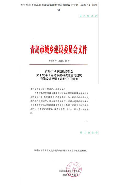 由我集團公司參與編制的全國首個被動房地方標準《青島市被動房低能耗建筑節(jié)能設(shè)計導則》正式頒布實施。