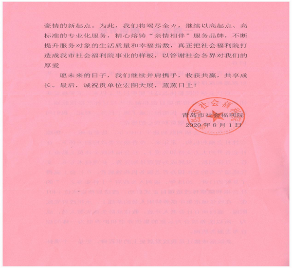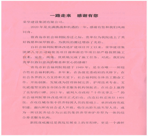 近日,集團(tuán)總部收到青島市社會福利院發(fā)來的表揚信,對八公司商俊堯和郝中華項目部改造擴(kuò)建青島市社會福利院項目提出表揚。