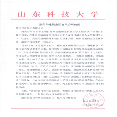 近日,集團總部收到山東科技大學發(fā)來的表揚信,對三公司四十五(劉順華)項目部施工的山東科技大學工程實訓中心項目提出表揚。