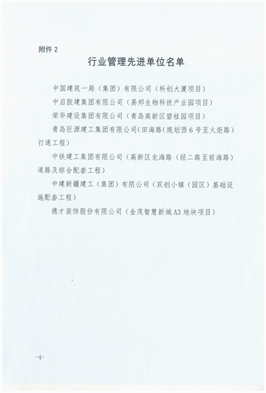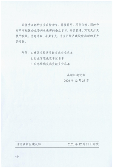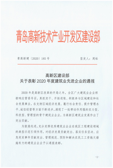 近期,青島高新區(qū)建設(shè)部發(fā)布《關(guān)于關(guān)于表彰2020年度建筑業(yè)先進(jìn)企業(yè)的通報(bào)》,三公司第十六(王慎平)項(xiàng)目部施工的青島高新區(qū)碧桂園項(xiàng)目綜合管理水平優(yōu)異,為集團(tuán)公司贏得“行業(yè)管理先進(jìn)單位”稱號(hào),并對(duì)集團(tuán)公司在重大活動(dòng)、應(yīng)急保障、清欠維穩(wěn)方面做出的突出貢獻(xiàn)進(jìn)行表彰。