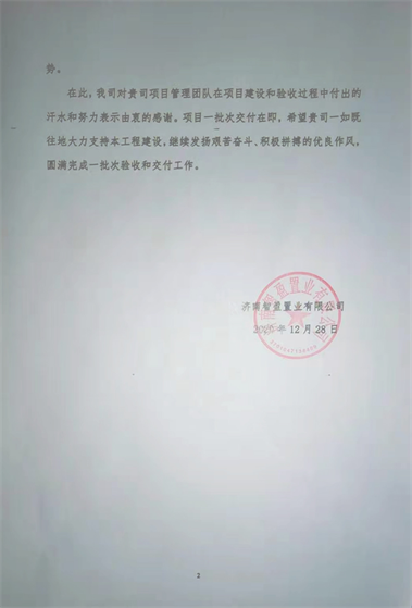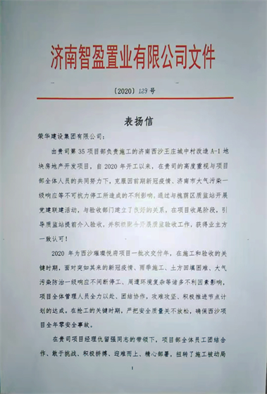近日,集團(tuán)公司總部收到濟(jì)南智盈置業(yè)有限公司發(fā)來(lái)的表?yè)P(yáng)信,對(duì)一公司第三十五(仇留強(qiáng))項(xiàng)目部施工的濟(jì)南西沙王莊城中村改造A-1地塊房地產(chǎn)開(kāi)發(fā)項(xiàng)目提出表?yè)P(yáng)。