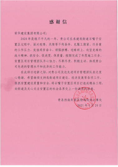 近日,集團公司收到青島西海岸新區(qū)隱珠街道辦事處發(fā)來的表揚信,對開發(fā)區(qū)公司第十四(邊先進)項目部施工的青島西海岸新區(qū)隱珠街道石嘴子安置區(qū)工程提出表揚。