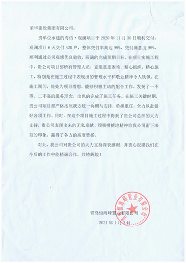 近期,集團(tuán)總部收到青島和恒海峰置業(yè)有限公司發(fā)來(lái)的表?yè)P(yáng)信,對(duì)四公司第三十四(朱勇)項(xiàng)目部施工的海信觀瀾項(xiàng)目提出表?yè)P(yáng)。