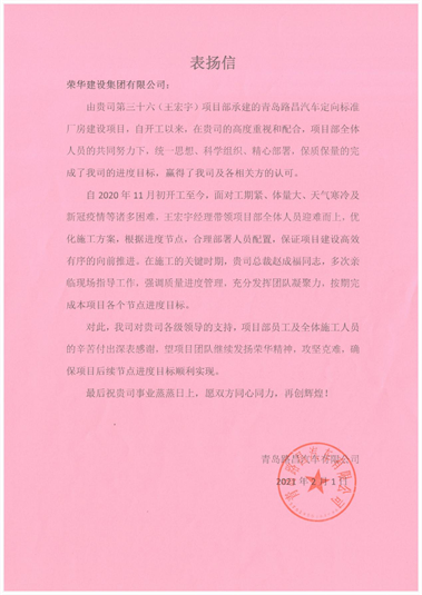 近期,集團(tuán)總部收到青島路昌汽車有限公司發(fā)來的表揚(yáng)信,對四公司王宏宇項(xiàng)目部施工的青島路昌汽車定向標(biāo)準(zhǔn)廠房建設(shè)項(xiàng)目提出表揚(yáng)。