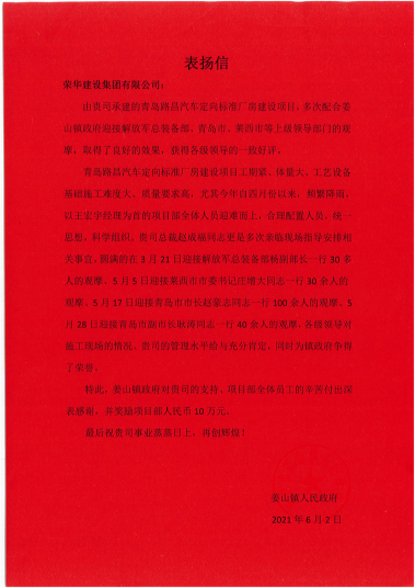 近期,集團總部收到姜山鎮(zhèn)人民政府發(fā)來的表揚信,對王宏宇項目部施工的青島路昌汽車定向標準廠房建設(shè)項目提出表揚。