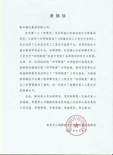 近期,集團(tuán)總部收到青島靈山灣影視文化區(qū)開發(fā)建設(shè)指揮部發(fā)來的表?yè)P(yáng)信,對(duì)李常杰項(xiàng)目部施工的海信海外總部基地項(xiàng)目提出表?yè)P(yáng)。