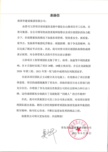 近期,集團(tuán)總部收到青島龍?zhí)╆傻轮脴I(yè)有限公司發(fā)來的表揚(yáng)信,對(duì)三公司王淳項(xiàng)目部施工的龍湖中德昆侖山路項(xiàng)目提出表揚(yáng)。