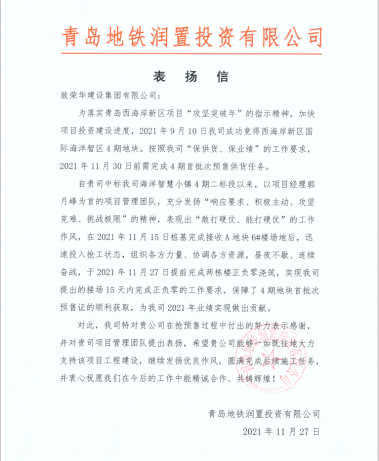 近日,集團(tuán)公司收到青島地鐵潤(rùn)置投資有限公司發(fā)來(lái)的表?yè)P(yáng)信,對(duì)開發(fā)區(qū)公司郭月峰項(xiàng)目部施工的西海岸新區(qū)國(guó)際海洋智區(qū)4期地塊項(xiàng)目提出表?yè)P(yáng)。