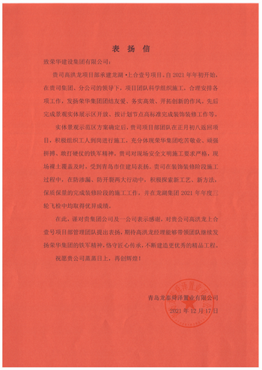 近日,集團公司收到青島龍?zhí)┧礉芍脴I(yè)有限公司發(fā)來的表揚信,對一公司高洪龍項目部施工的龍湖·上合壹號項目提出表揚。