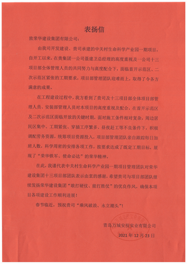 近日,集團(tuán)公司收到青島萬城安投實(shí)業(yè)有限公司發(fā)來的表揚(yáng)信,對(duì)一公司高洪龍項(xiàng)目部施工的中關(guān)村生命科學(xué)產(chǎn)業(yè)園一期項(xiàng)目提出表揚(yáng)。