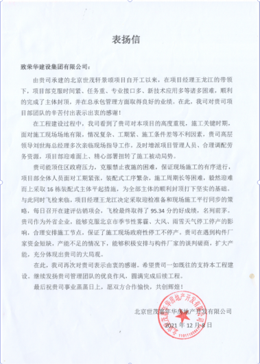 近日,集團(tuán)公司收到北京世茂嘉年華房地產(chǎn)開發(fā)有限公司發(fā)來的表揚(yáng)信,對八公司第二十九項目部施工的北京世茂軒景頌項目提出表揚(yáng)。
