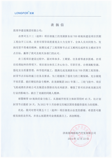 近日,集團(tuán)公司收到濟(jì)南泰鴻房地產(chǎn)開發(fā)有限公司發(fā)來(lái)的表?yè)P(yáng)信,對(duì)濟(jì)南公司趙帥項(xiàng)目部施工的龍湖新東站TOD南地塊建設(shè)項(xiàng)目四期提出表?yè)P(yáng)。